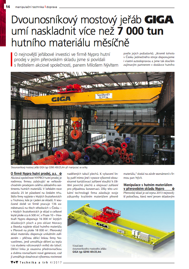 Článek o dvounosníkovém mostovém jeřábu Giga, časopis Technika a Trh